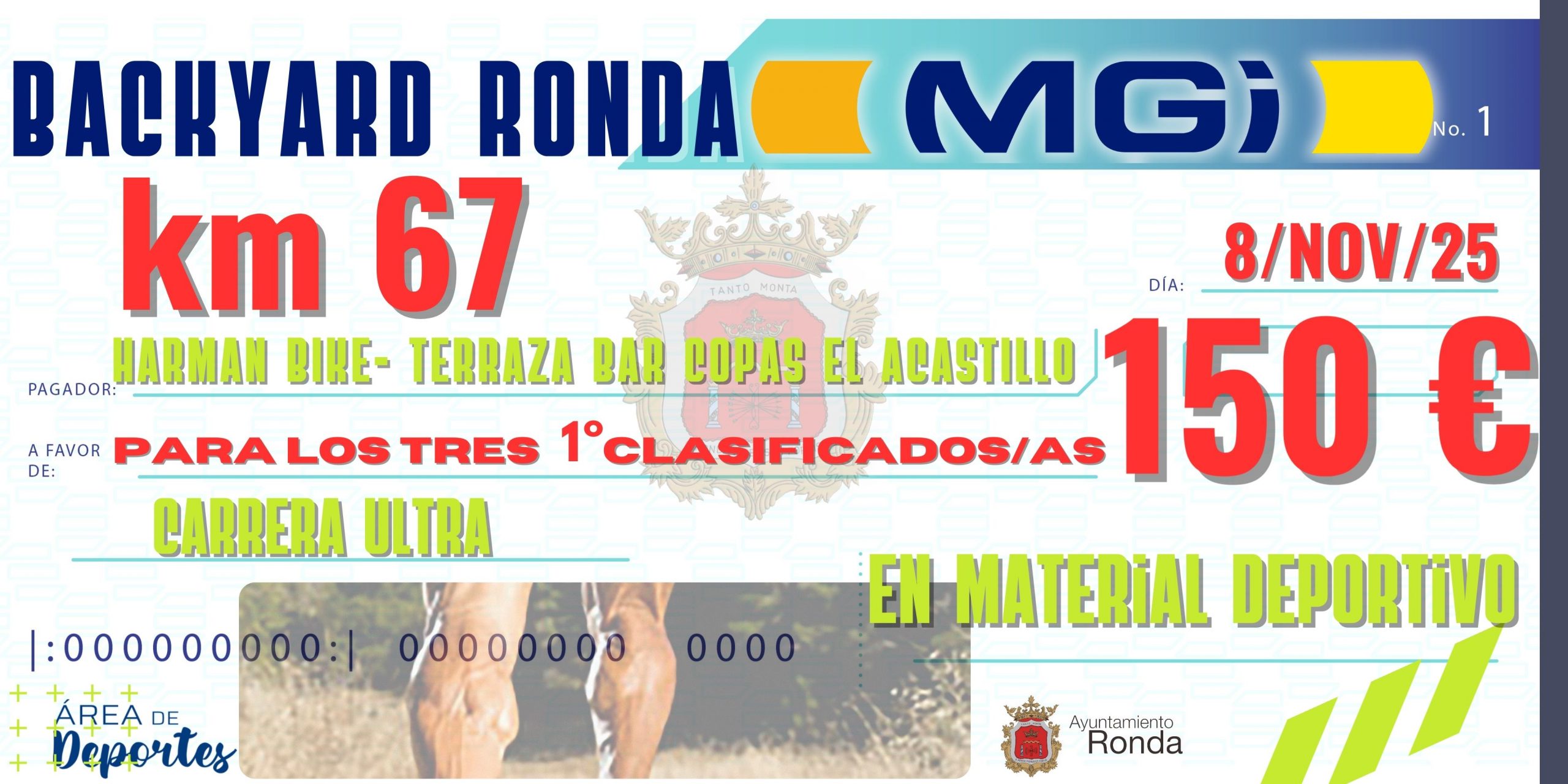 - 150€ en material deportivo, para los/las 3 primer@s que entren en meta en la décima vuelta (km 67).